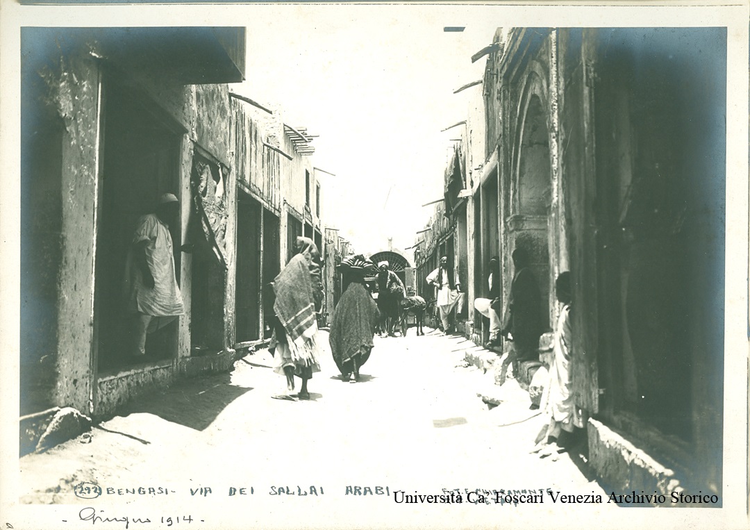 Fotografia in B/N realizzata in gelatina ai sali d'argento su carta ; Sul bordo inferiore dell'immagine la scritta a penna: 292 Bengasi - via dei Sallai arabi -Fot. E. Chiaramonte - rip. vietata ; In basso a sinistra la data: Giugno 1914