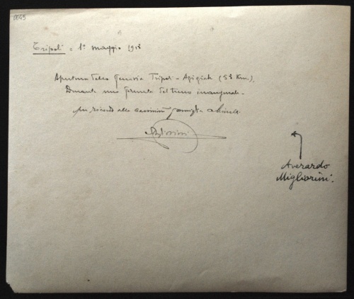 Verso della foto: inv. n. 0045 ; scritta dedicatoria a penna: "Tripoli = 1 maggio 1913 / Apertura della ferrovia Tripoli - Aziziah (53 km), / Durante una fermata del treno inaugurale. / Per ricordo alla carissima famiglia Minali. / A Migliorini".