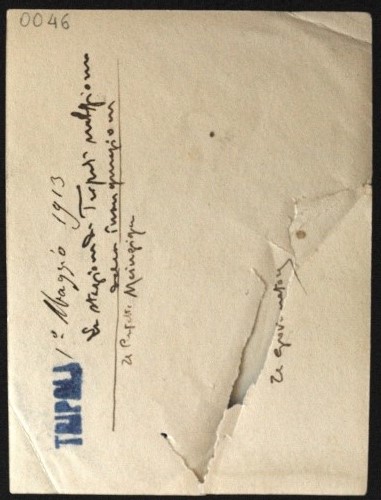 Verso della foto inv. n. 0046: Timbro ad inchiostro blu con la scritta "TRIPOLI" in basso a sinistra ; Nota a penna: "1. Maggio 1913 / La stazione i Tripoli nelgiorno [sic] della inaugurazione. / Il Prefetto M[eingign] centrata a sinistra ; La scritta "Il governatore" in basso a destra ; Numero d'inventario scritto a matita, in alto a sinistra.