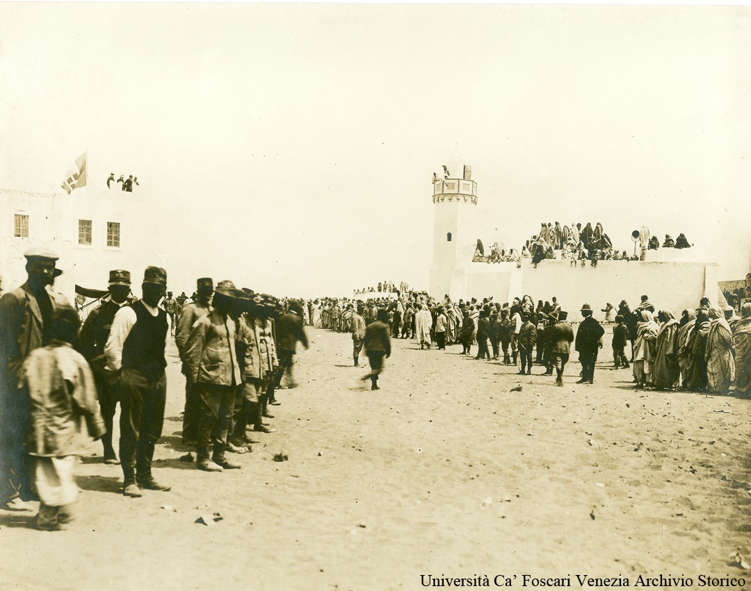 Una folla, composta di soldati, civili e autoctoni, è schierata per assistere alle manifestazioni di intrattenimento in occasione dell'inaugurazione della ferrovia Tripoli-Azizia.