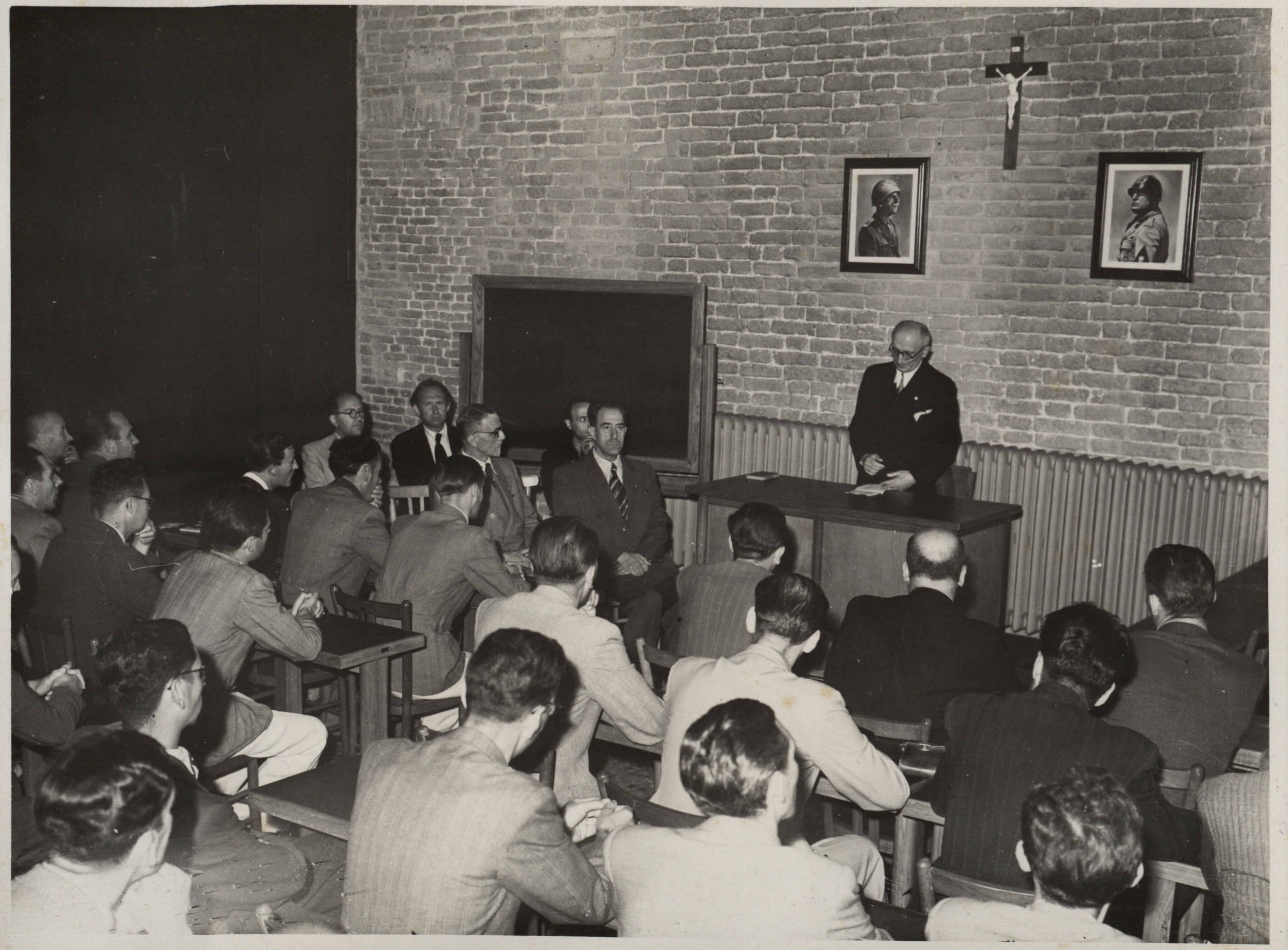 Si intravede, seduto a fianco della cattedra assieme ad altri docenti, il rettore Carlo Alberto Dell'Agnola.