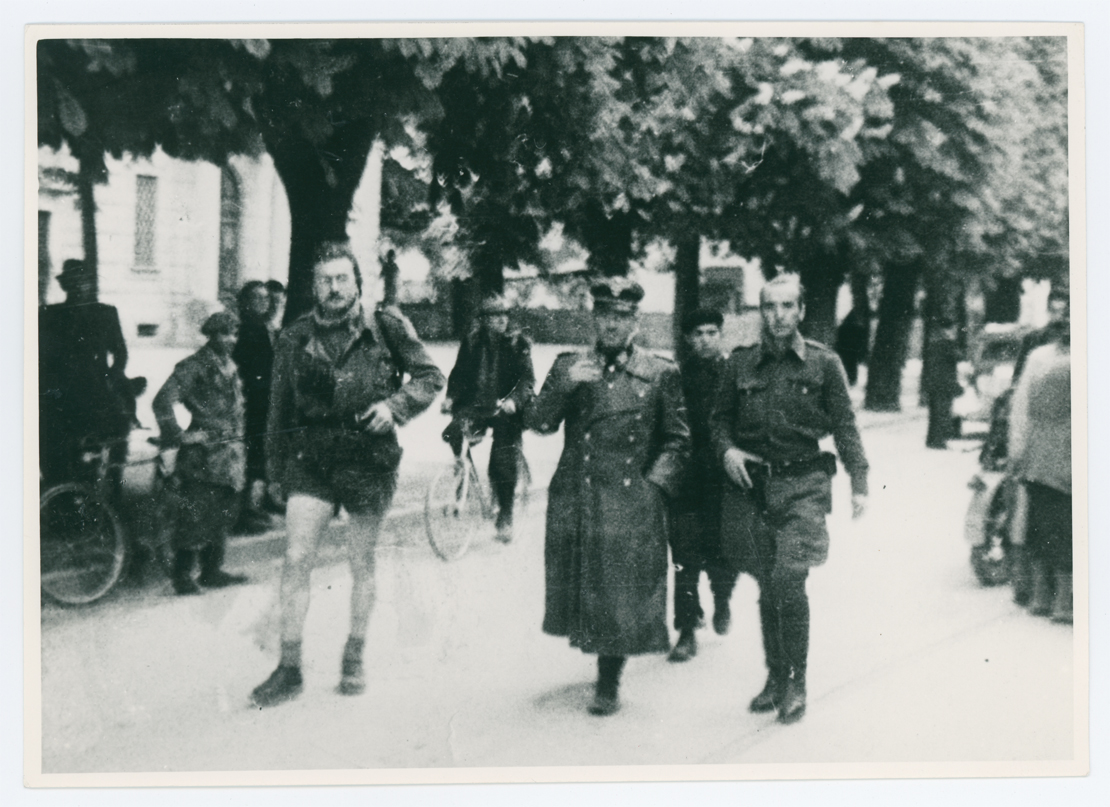 Vittorio Veneto (Treviso), 30 aprile 1945. Il generale Jürgen von Kamptz, capo della polizia germanica in Italia, tra Giuseppe Rosini "Figaro", commissario della Brigata "Cairoli" della Divisione Nannetti (a sinistra), e Ermenegildo Pedron “Libero”, comandante della Brigata (a destra).