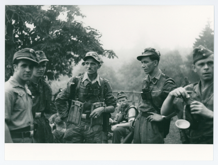 Fotografia di soldati appartenenti alle S.D. e alle truppe alpine. Le S.D. (Sicherheitsdienst) erano il servizio di spionaggio e polizia segreta del partito nazionalsocialista.