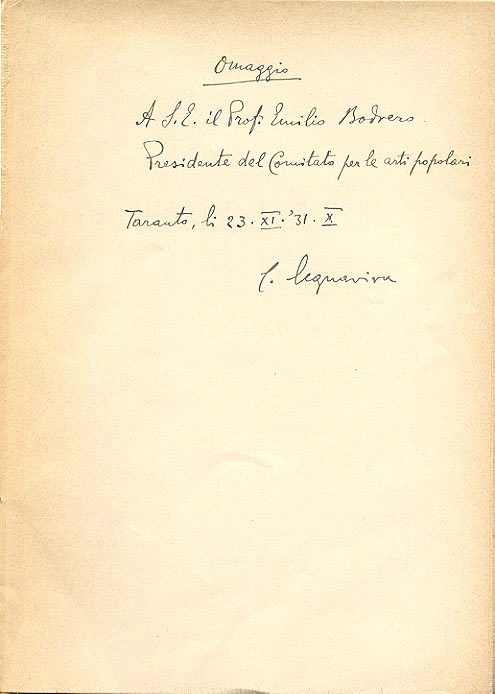 Dedica manoscritta dell'autore: Omaggio / A S. E. il Prof. Emilio Bodrero / Presidente del Comitato per le arti popolari / Taranto, li 23-XI-'31-X / C. Acquaviva
