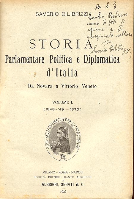 Dedica manoscritta dell'autore: A S. E. / Emilio Bodrero / uomo di fede di / azione e di / eccezionale cultura / Saverio Cilibrizzi
