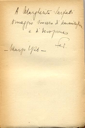 Dedica manoscritta dell'autore: A Margherita Sarfatti / omaggio sincero di ammirazione / e di devozione / Fed. / Marzo 1926