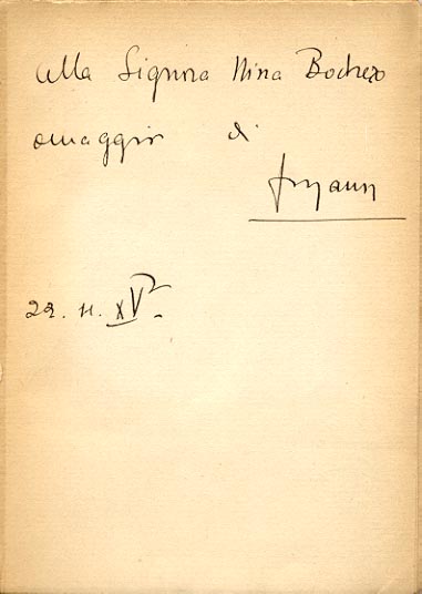 Dedica manoscritta dell'autore: alla Signora Nina Bodrero / omaggio di / Forzano / 29.11.XV