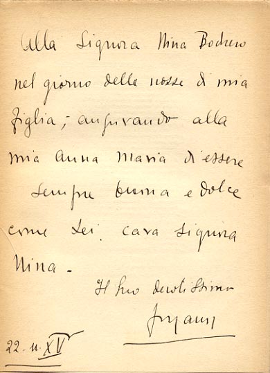 Dedica manoscritta dell'autore: Alla Signora Nina Bodrero / nel giorno delle nozze di mia / figlia; augurando alla / mia Anna Maria d'essere / sempre buona e dolce / come Lei cara signora / Nina. / Il suo devotissimo / Forzano / 22.11.XV