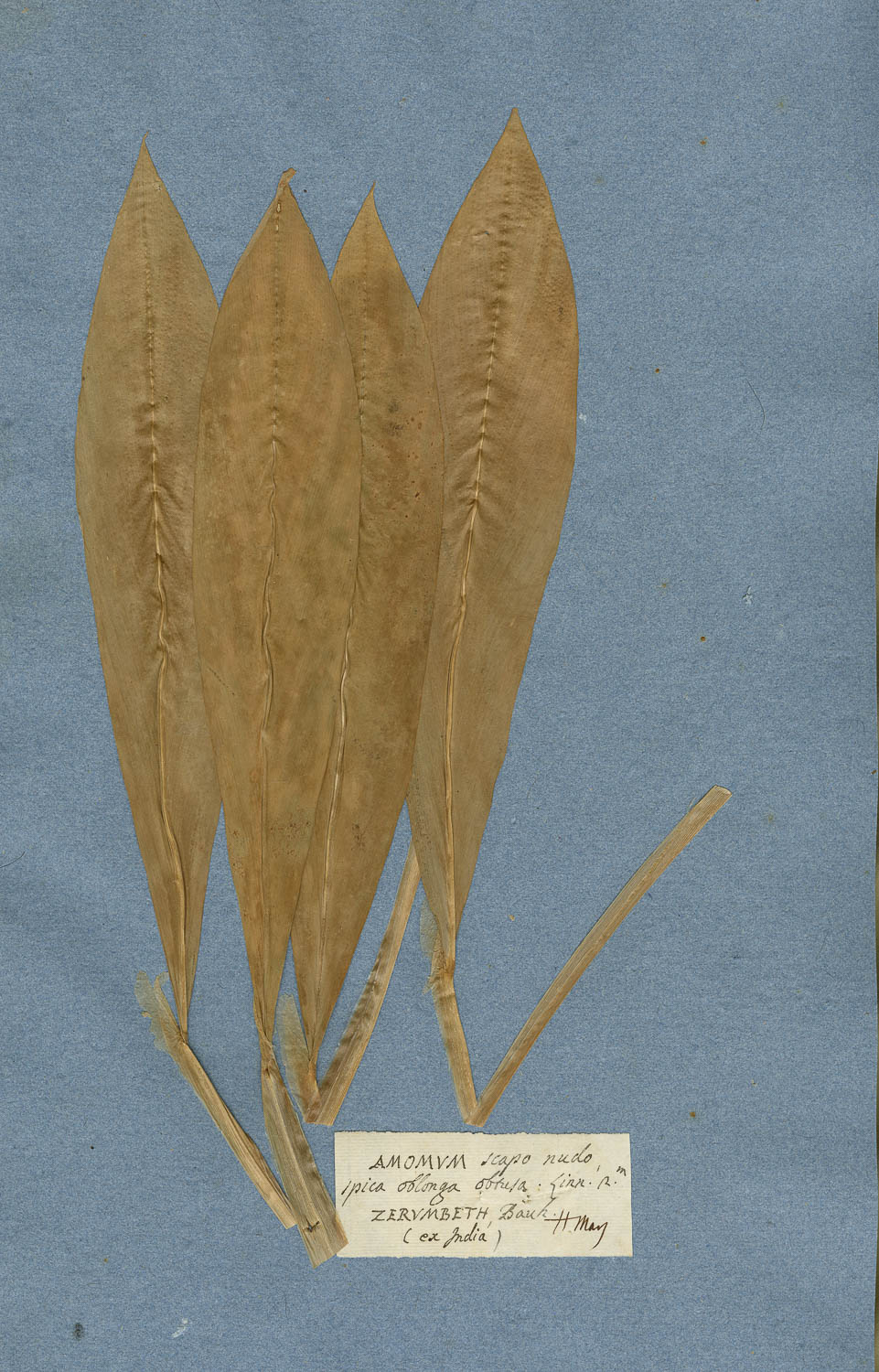 Foglio dell'erbario di Giovanni Marsili con cartellino manoscritto: AMOMUM scapo nudo, spica oblonga obtusa. Linn. 2a