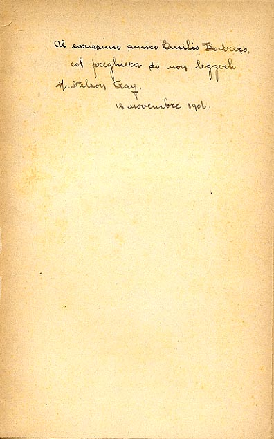 Dedica manoscritta del curatore: Al carissimo amico Emilio Bodrero, / col preghiera di non leggerlo / H. Nelson Gay / 12 novembre 1906