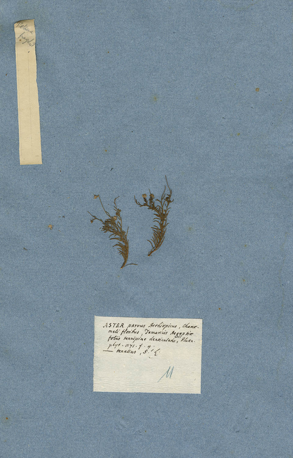 Foglio dell'erbario di Giovanni Marsili con cartellino manoscritto: ASTER parvus Aethiopicus, Chamaemeli floribus, Tamaricis Aegyptiae foliis tenuissime denticulatis, Plukn. Phyt. 271 f. 4