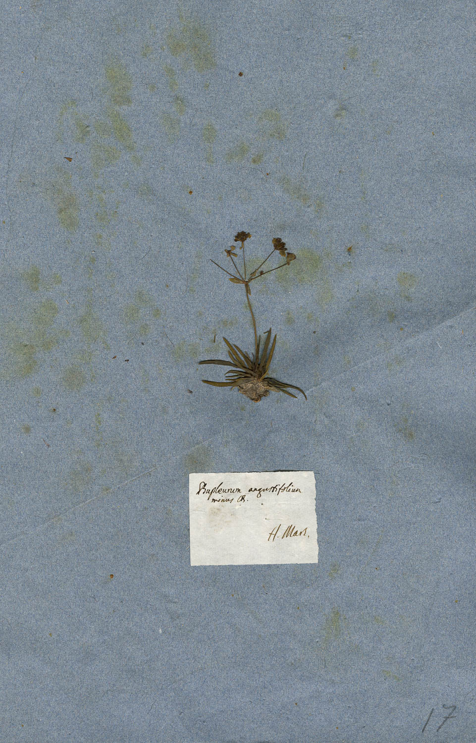 Foglio dell'erbario di Giovanni Marsili con cartellino manoscritto: Bupleurum angustifolium minus C.B.