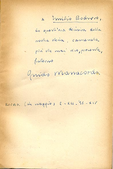 Dedica manoscritta dell'autore: a Emilio Bodrero, / in quest'ora decisiva della / nostra storia, camerata / piu' che mai vivo, presente / fraterno / Guido Manacorda / Berna (in maggio) 2-XII-'35-XIV