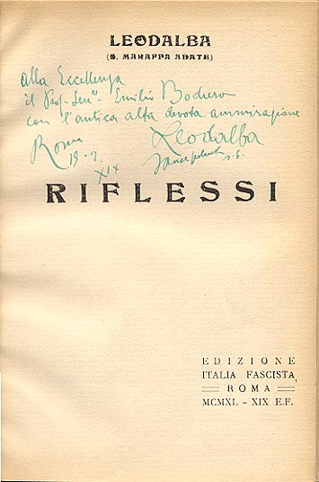 Dedica manoscritta dell'autore: Alla eccellenza / il prof. Sen.re Emilio Bodrero / con l'antica alta devota ammirazione / Leodalba / Roma / 19.2.XIX