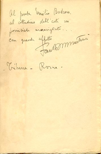 Dedica manoscritta dell'autore: Al poeta Emilio Bodrero, / al cittadino dell'arte un / provinciale meravigliato... / con grande affetto / Fausto M. Martini / Tribuna - Roma