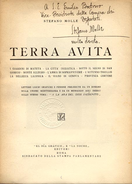 Dedica manoscritta dell'autore: A S. E. Emilio Bodrero / Vice Presidente della Camera dei / Deputati / Stefano Molle / molto devoto