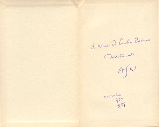 Dedica manoscritta dell'autore: A Nina ed Emilio Bodrero / devotamente / A. S. N. / novembre / 1937