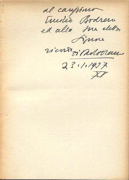 Dedica manoscritta dell'autore: al carissimo / Emilio Bodrero / ed alla sua eletta / figura / ricordo / di Paolo Orano / 23-1-1937/XV