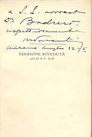 Dedica manoscritta dell'autore: a S. E. avvocato / Dr. Bodrero / rispettosamente M. Palanti / Milano luglio 32-X