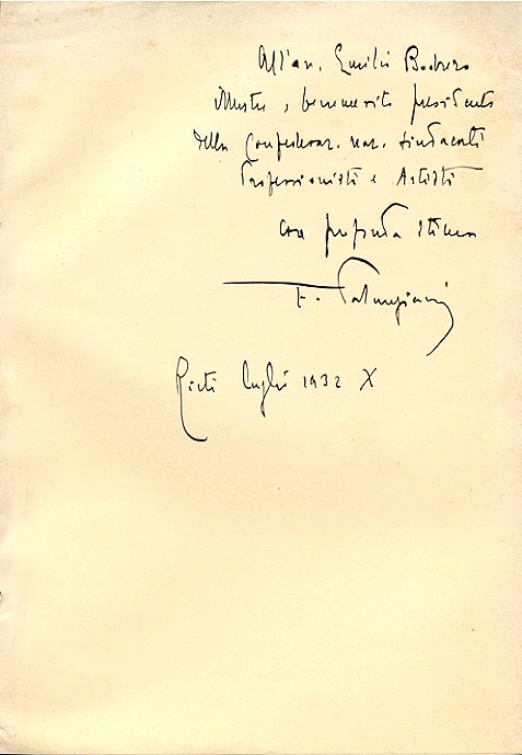 Dedica manoscritta dell'autore: All'on. Emilio Bodrero / illustre, benemerito presidente / della Confederaz. naz. sindacati / Professionisti e Artisti / con profonda stima / F. Palmegiani / Rieti
