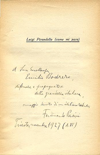 Dedica manoscritta dell'autore: a Sua Eccellenza / Emilio Bodrero, / difensore e propugnatore / della grandezza italiana, / omaggio devoto di un italiano redento: / Ferdinando Pasini / Trieste, novembre 1927 (A. VI)
