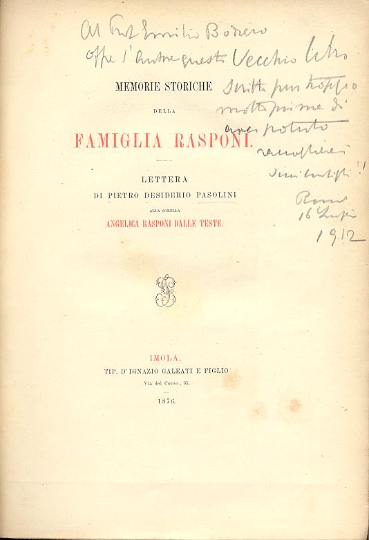 Memorie storiche della famiglia Rasponi : lettera di Pietro Desiderio Pasolini alla sorella Angelica Rasponi dalle Teste. - Imola : Galeati, 1876