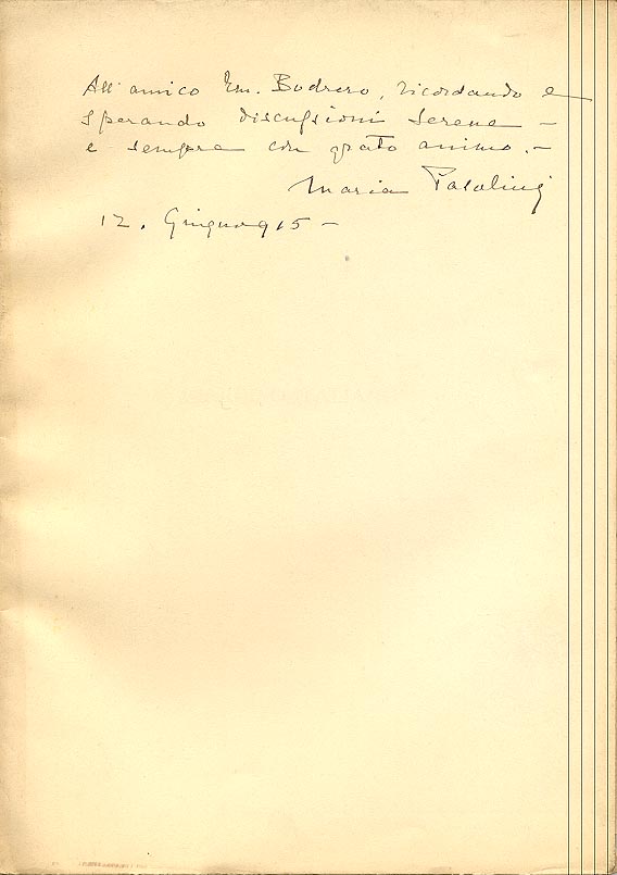 Dedica manoscritta dell'autore: All'amico Em. Bodrero, ricordando e / sperando discussioni serene / e sempre con grato animo / Maria Pasolini / 12 Giugno 915