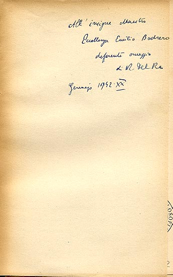 Dedica manoscritta del traduttore: All'insigne Maestro / Eccellenza Emilio Bodrero / deferente omaggio / di R. Del Re / Gennaio 1942.XX