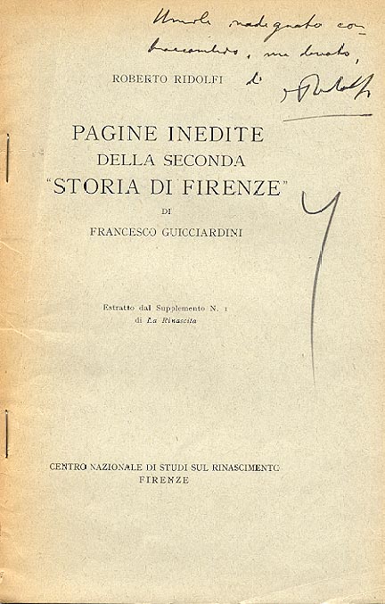 Pagine inedite della seconda "Storia di Firenze" di Francesco Guicciardini / Roberto Ridolfi. - Firenze : Centro Nazionale di Studi sul Rinascimento, [19..]