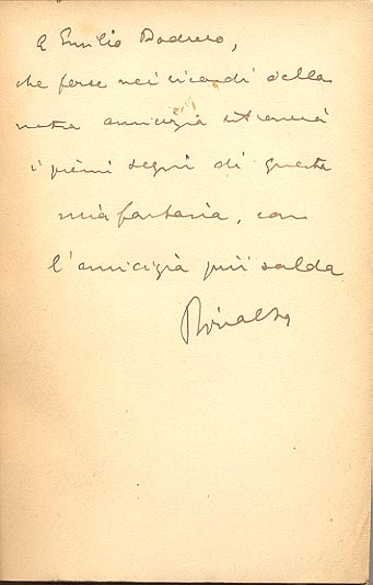 Dedica manoscritta dell'autore: a Emilio Bodrero, / che forse nei ricordi della / nostra amicizia ritroverà / i primi segni di questa / mia fantasia, con / l'amicizia piu' salda / Rivalta