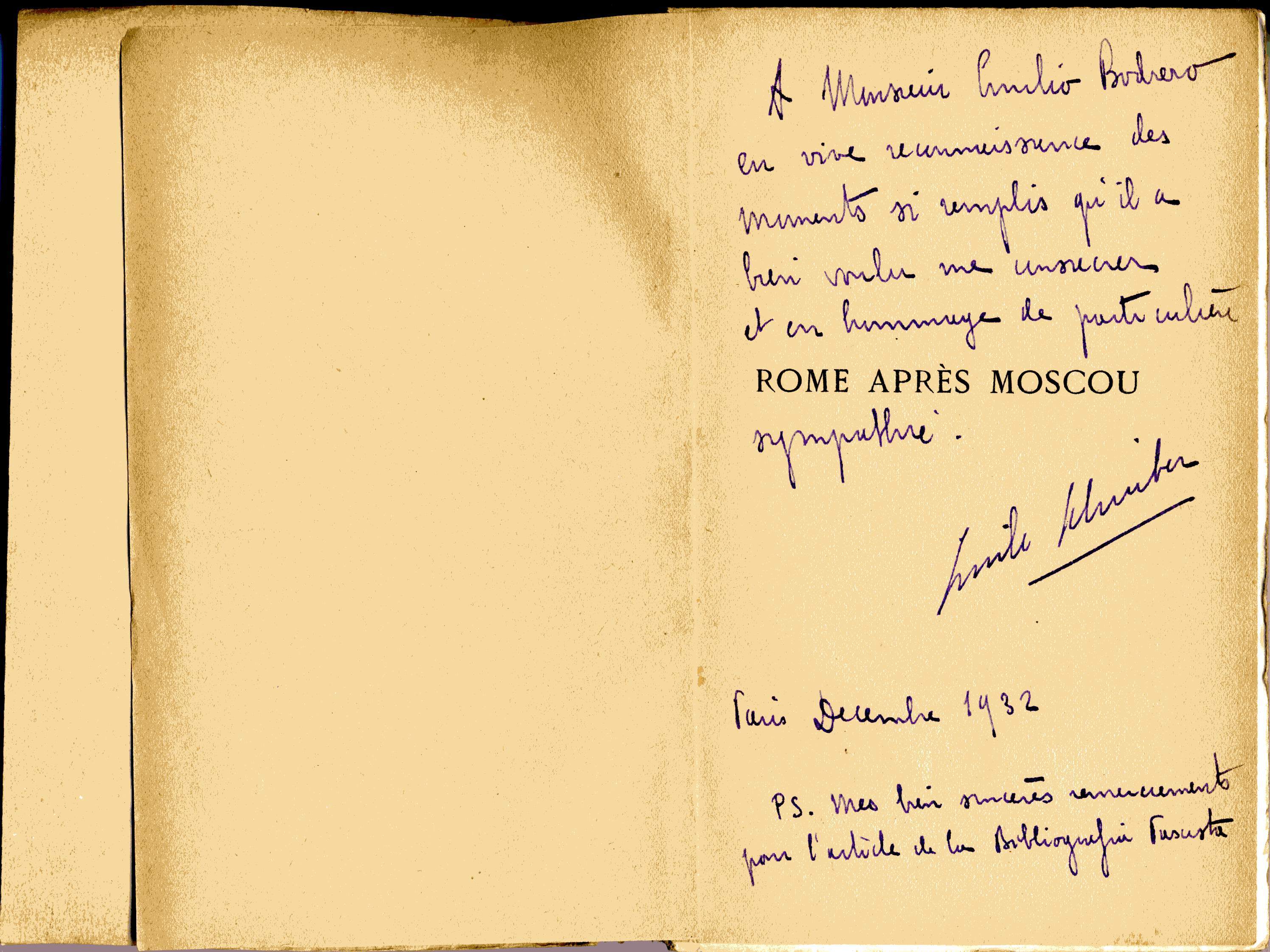 Dedica manoscritta dell'autore: A Monsieur Emilio Bodrero / en vive reconnaissance des / moments si remplis qu'il a / bien voulu me consacrer / et en hommage de particuliere sympathie. / Emile Schreiber / Paris Decembre 1932 / PS: Mes bien sinceres remerceiments / pour l'article de la Bibliografia fascista