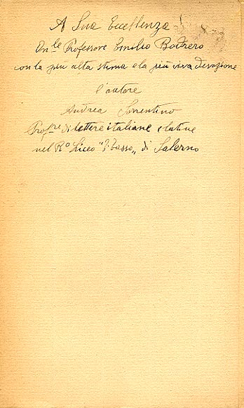Dedica manoscritta dell'autore: A Sua Eccellenza / On.le Professore Emilio Bodrero / con la piu' alta stima e la piu' viva devozione / l'autore / Andrea Sorrentino / Prof.re di lettere italiane e latine / nel R. Liceo "T. Tasso" di Salerno