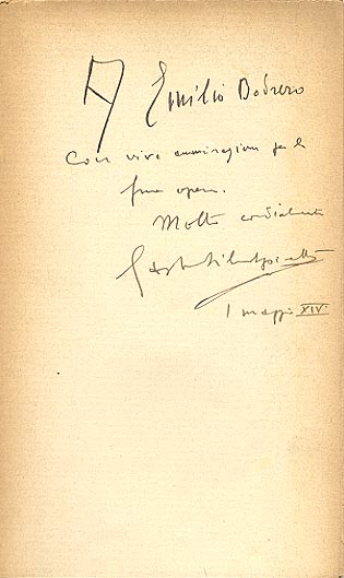 Dedica manoscritta dell'autore: A Emilio Bodrero / con viva ammirazione per la / sua opera. / Molto cordialmente / Gastone Silvano Spinetti / 1 maggio XIV.