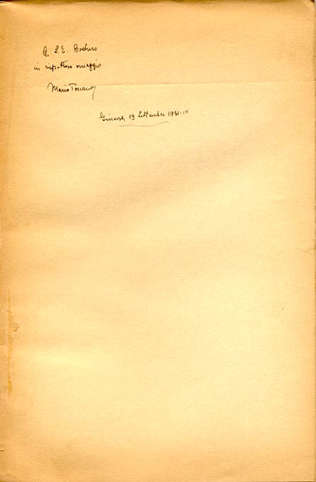 Dedica manoscritta dell'autore: A S. E. Bodrero / in rispettoso omaggio / Mario Toscano / Firenze 13 Settembre 1931-IX