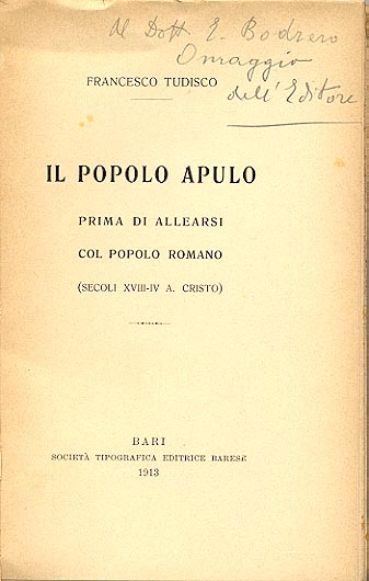 Il popolo apulo prima di allearsi col popolo romano : secoli 18.-4. a. Cristo / Francesco Tudisco. - Bari : Società Tipografica Editrice Barese, 1913