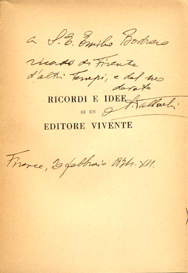 Dedica manoscritta dell'autore: a S. E. Emilio Bodrero / ricordo di Firenze / d'altri tempi, e del tuo / devoto / A. Vallecchi / Firenze, 20 febbraio 1934.XII