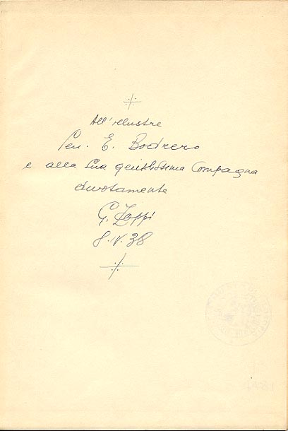 Dedica manoscritta dell'autore: All'illustre / Sen. E. Bodrero / e alla sua gentilissima Comapagna / devotamente / G. Zoppi / 8.IV.38