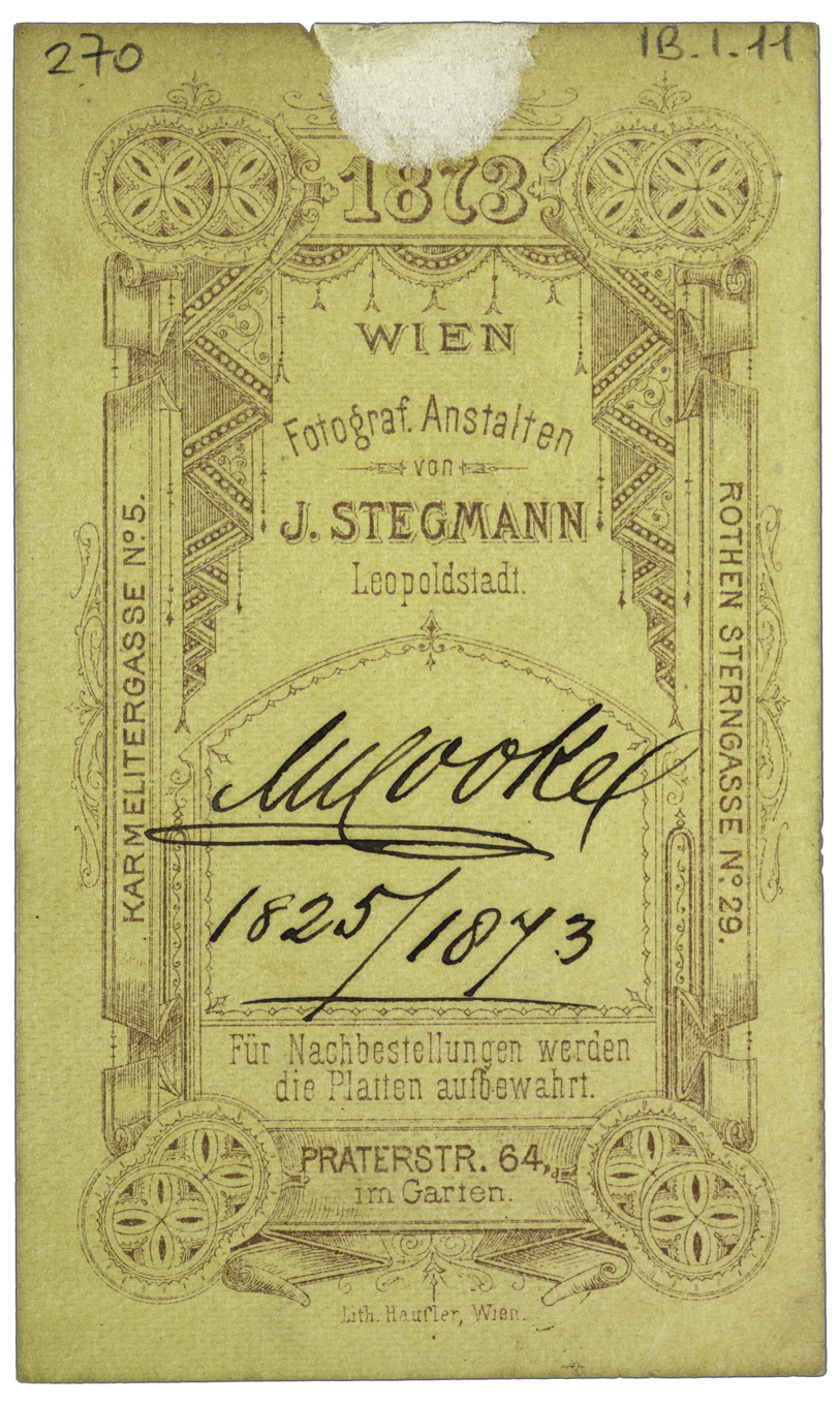Titolo manoscritto e data di nascita (n. 1825) riportati sul recto, dove compare anche la data: 12 july (manoscritta) 1873 (a stampa).