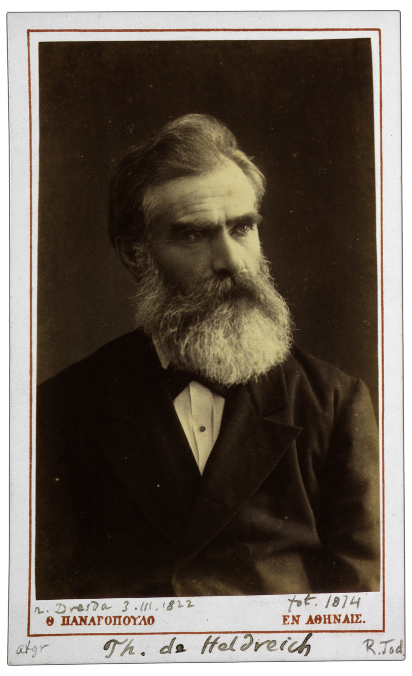 Titolo manoscritto sul recto, dove compaiono le note: R. Tod. [Raccolta Todaro]; atgr.; n. Dresda 3.III.1822 [data di nascita]; fot. 1824. Nota manoscritta anche sul verso: Th. de Heldreich nato in Dresda 3 Marzo 1822 Fotogr. in Atene Genn. 1874.