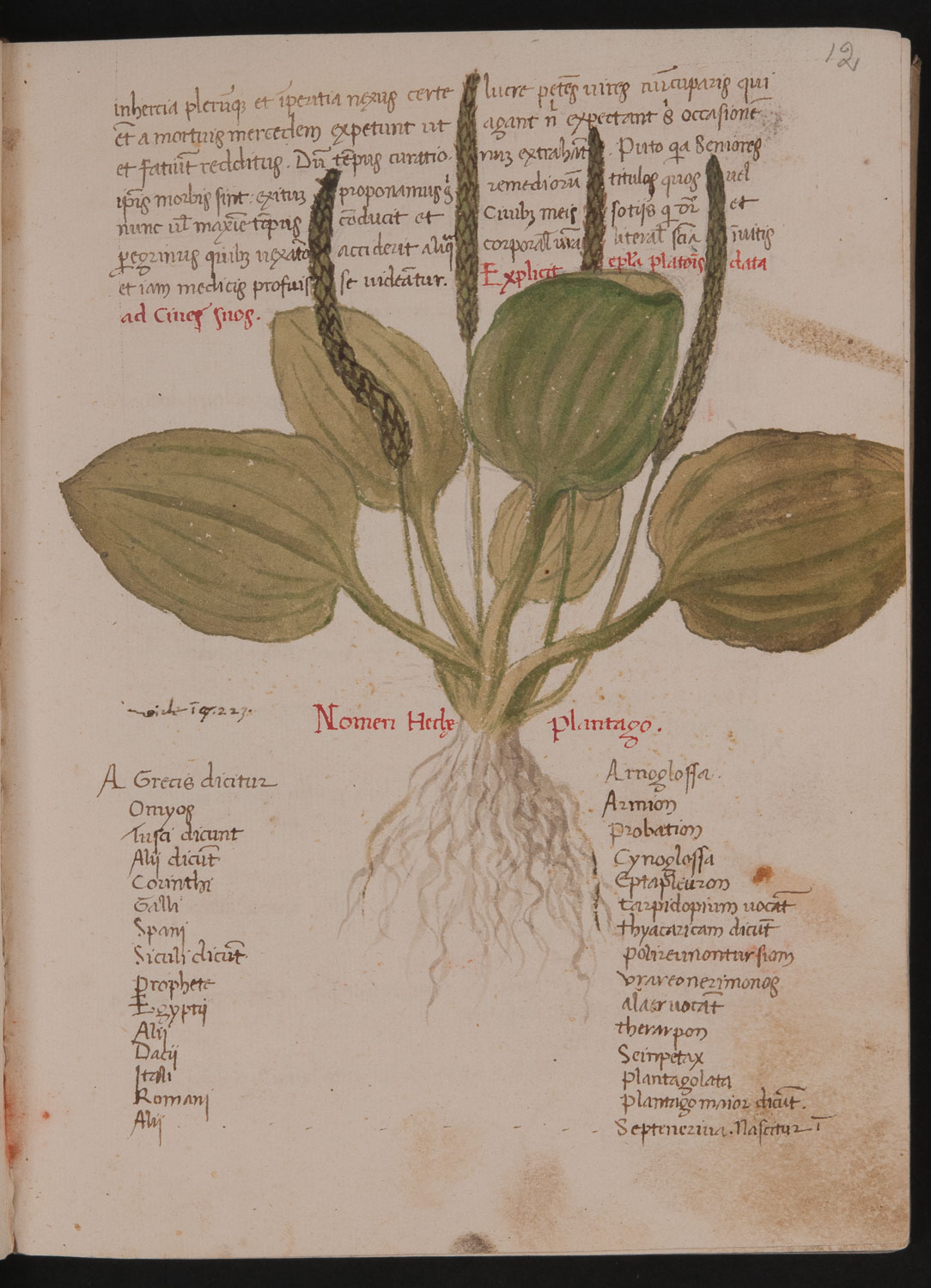 Manoscritto cartaceo miniato, forse copia (o copia di copia) del manoscritto Laurenziano Plut.76.16 (Firenze, Biblioteca Medicea Laurenziana). Elenca 132 piante sulla base del loro principale uso terapeutico.