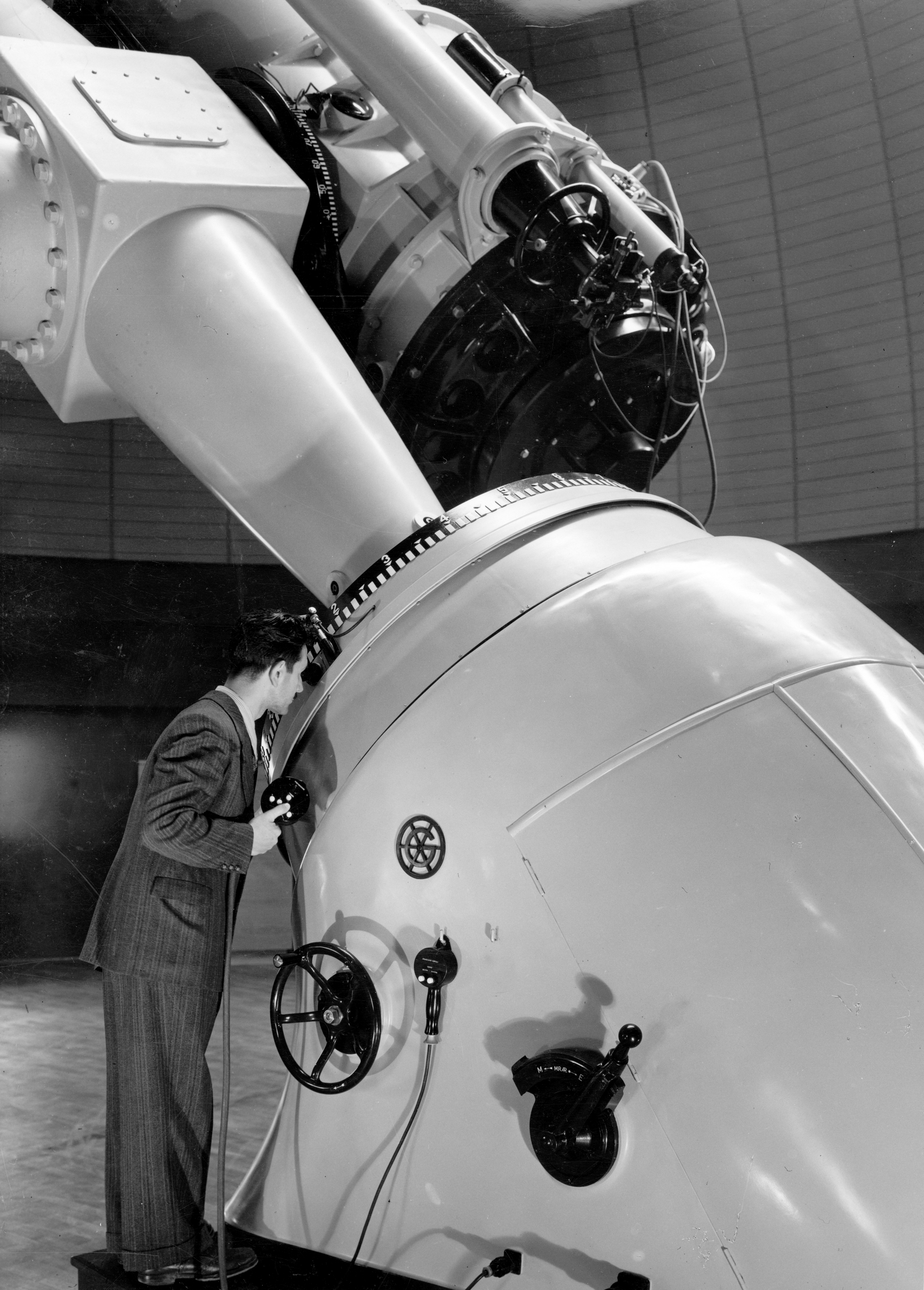 Il sostegno sud e la parte inferiore del tubo telescopico con il dott. Taffara al microscopio del cerchio orario.