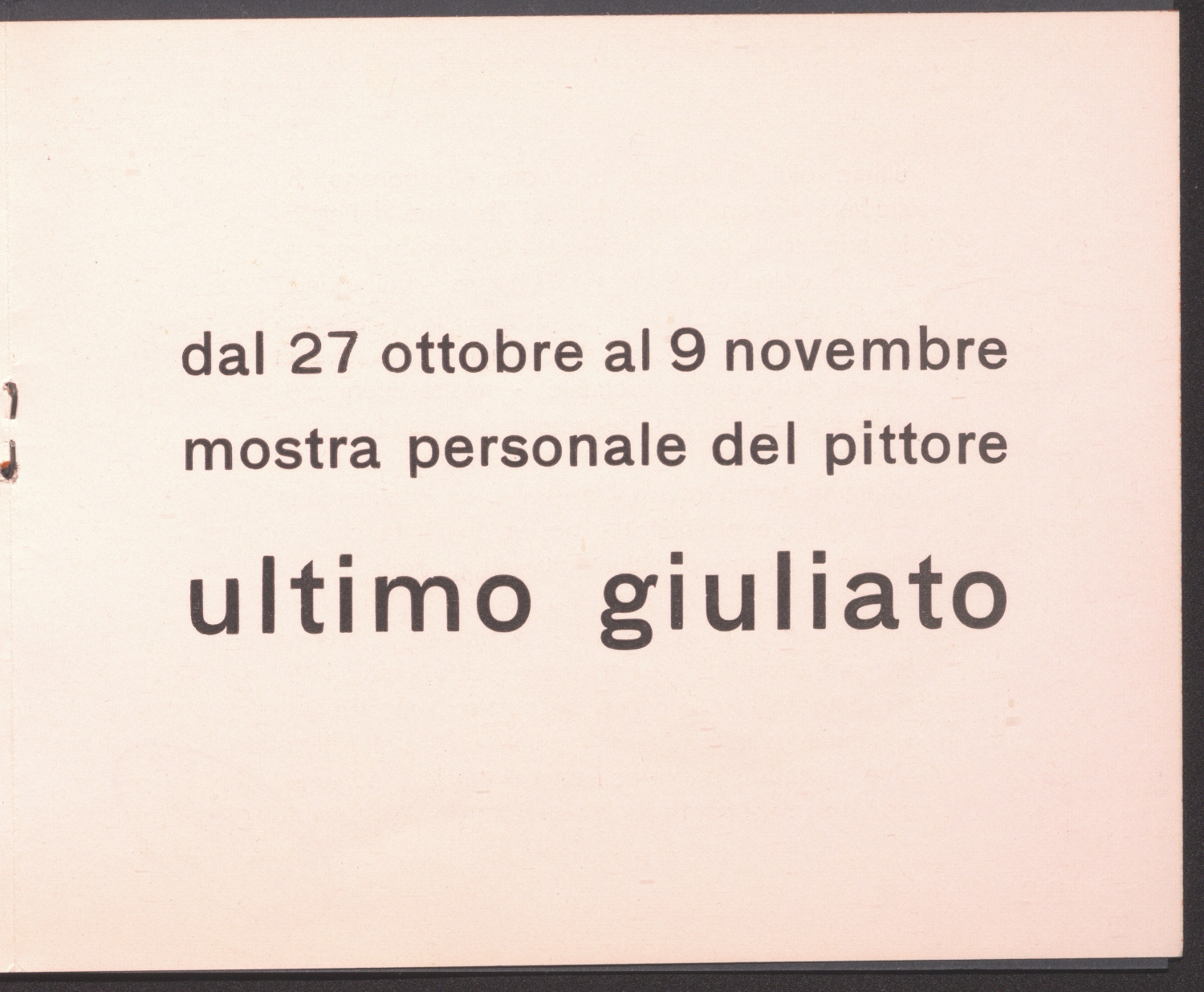 Biglietto d'Invito della mostra di Ultimo Giuliato alla Galleria d'arte moderna Piranesi a Mogliano Veneto, TV. Con breve biografia alla fine.