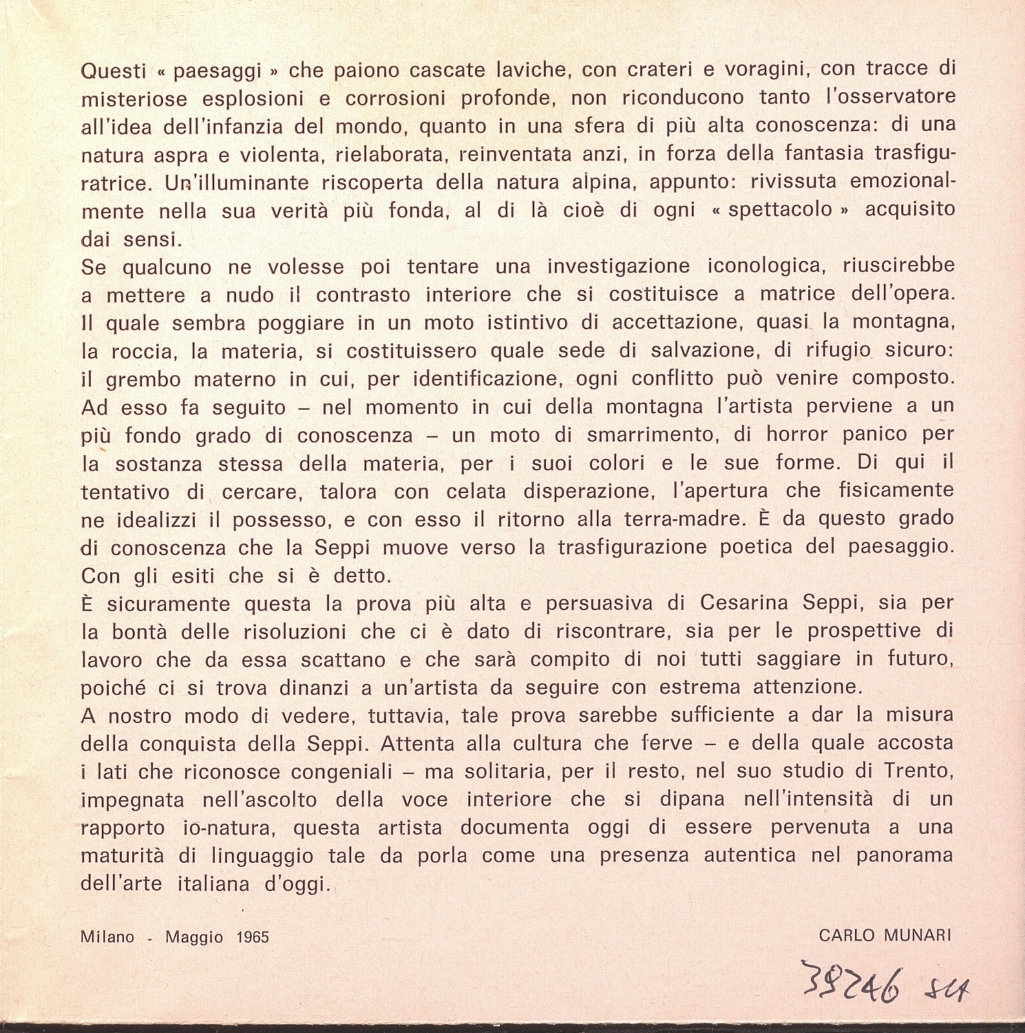 "Pieghevole di presentazione della mostra dell'artista Cesarina Seppi (Trento, 20 maggio 1919 – Trento, 29 dicembre 2006) dall'1 marzo al 14 marzo 1966, presso la Galleria Vismara di Milano. Negli anni '60 l'artista sperimenta un tipo di pittura materica, ricorrendo per le sue opere a sabbie, colle e colore a olio con inserimento di tessere musive.