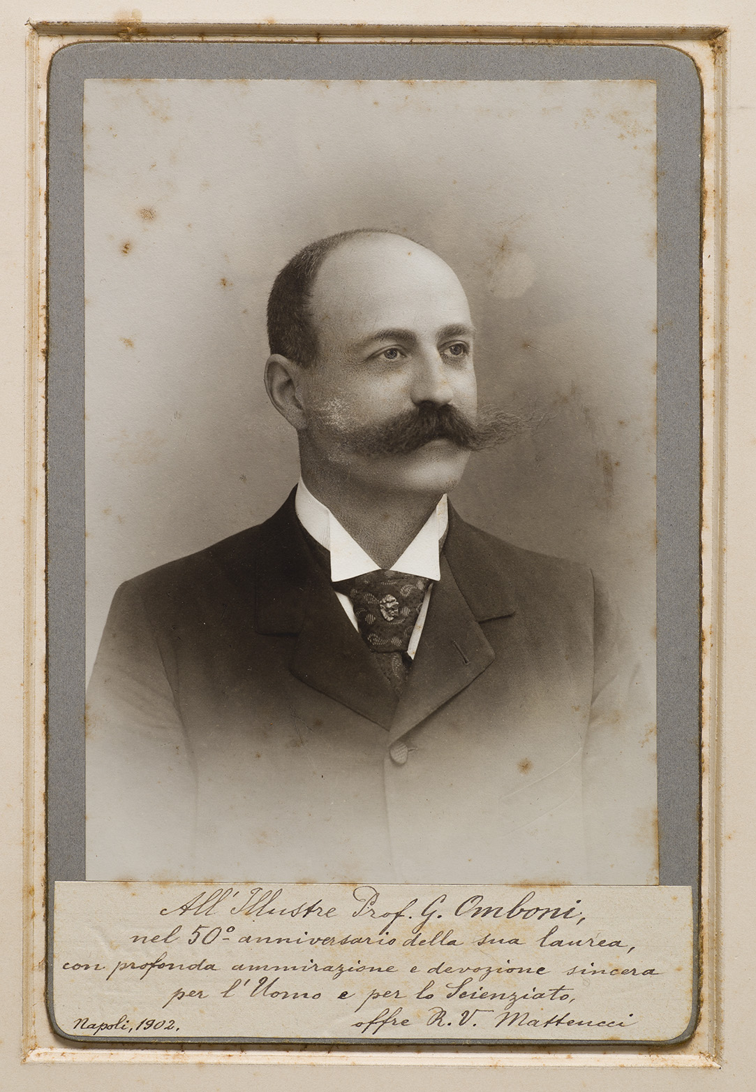 Nota manoscritta sul recto: All'Illustre Prof. G. Omboni, nel 50° anniversario della sua laurea, con profonda ammirazione e devozione sincera per l'Uomo e per lo Scienziato offre R.V. Matteucci. Napoli, 1902.