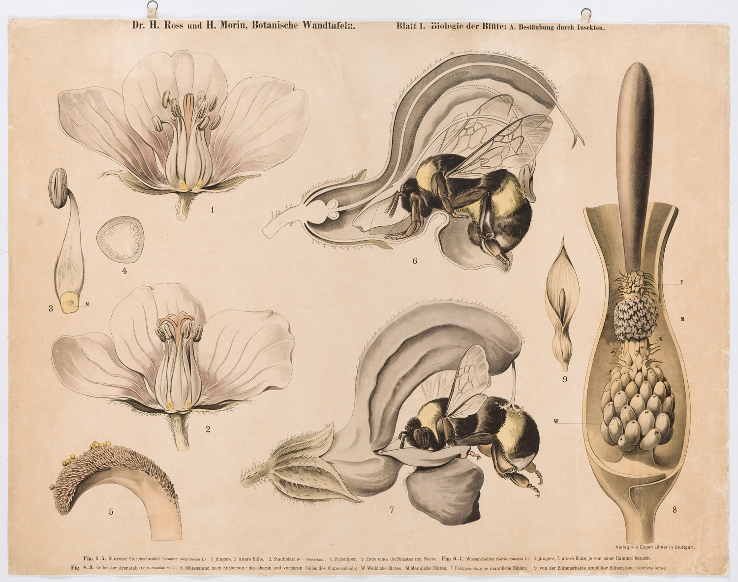 Botanische Wandtafeln. Blatt 1. Biologie der Blüte. Le prime cinque immagini riguardano un fiore di geranio (Geranium sanguineum L.)con particolari dello stigma, dello stame e il polline, altre due raffigurano un fiore di salvia (Salvia pratensis L.) con l'impollinatore, le ultime due un fiore di gigaro (Arum maculatum L.) anche in sezione