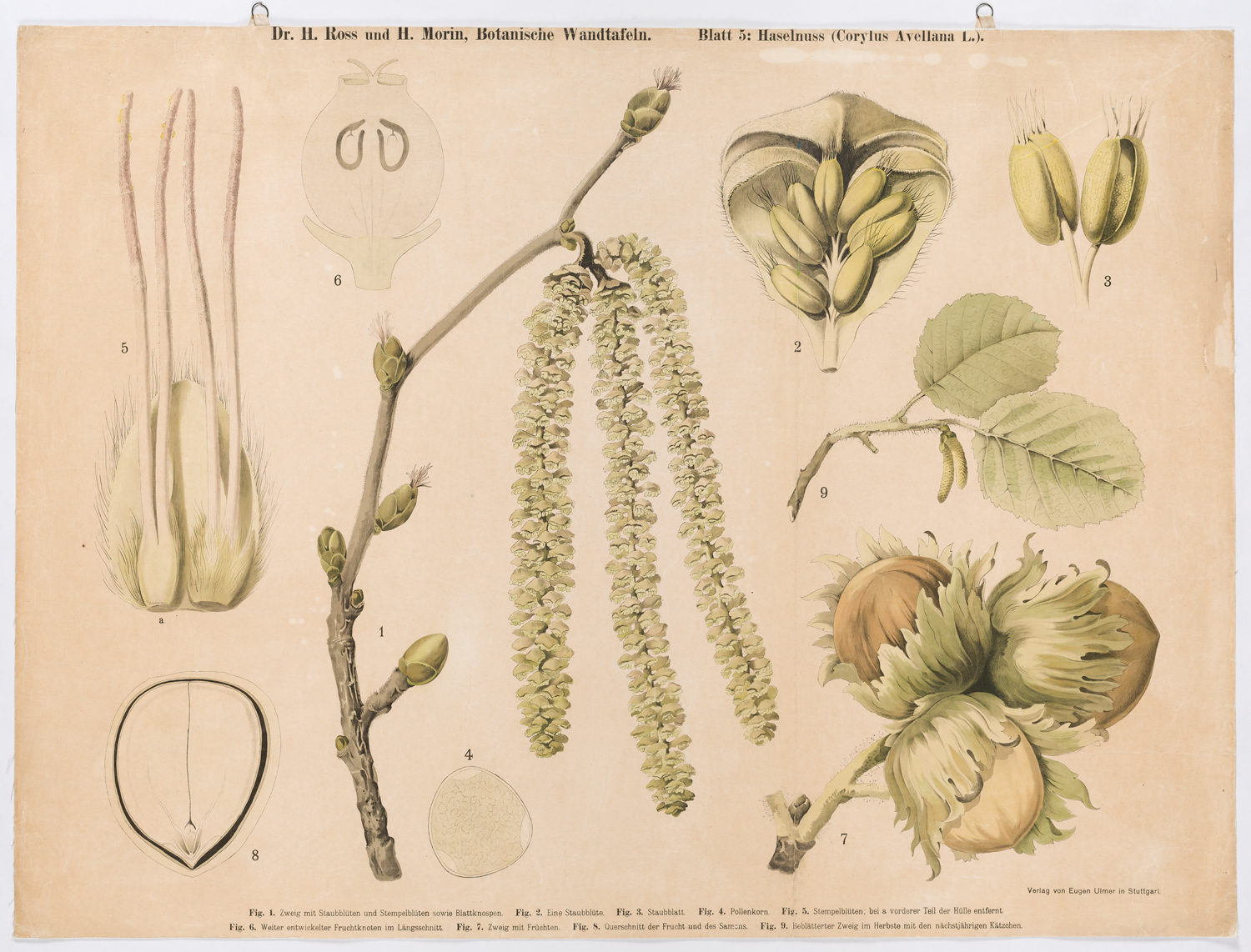 Botanische Wandtafeln. Blatt 5. La tavola raffigura un ramo con infiorescenze maschili, un singolo fiore maschile, un fiore femminile, un granulo pollinico, i frutti, un frutto in sezione e un ramo con le foglie