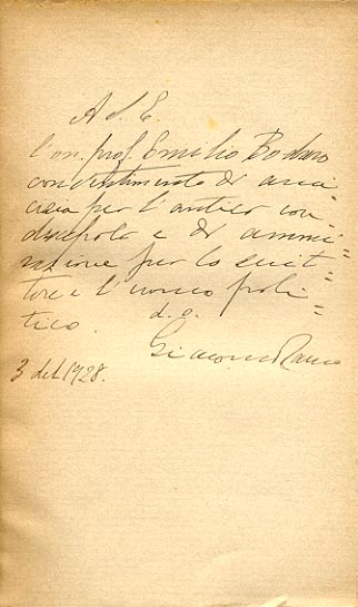 Dedica manoscritta dell'autore: A S. E. / l'on. prof. Emilio Bodrero / con sentimento di amici- / zia per l'antico con- / discepolo e di ammi- / razione per lo scrit- / tore e l'uomo poli- / tico. d. o. / Giacomo Tauro / 3 del 1928